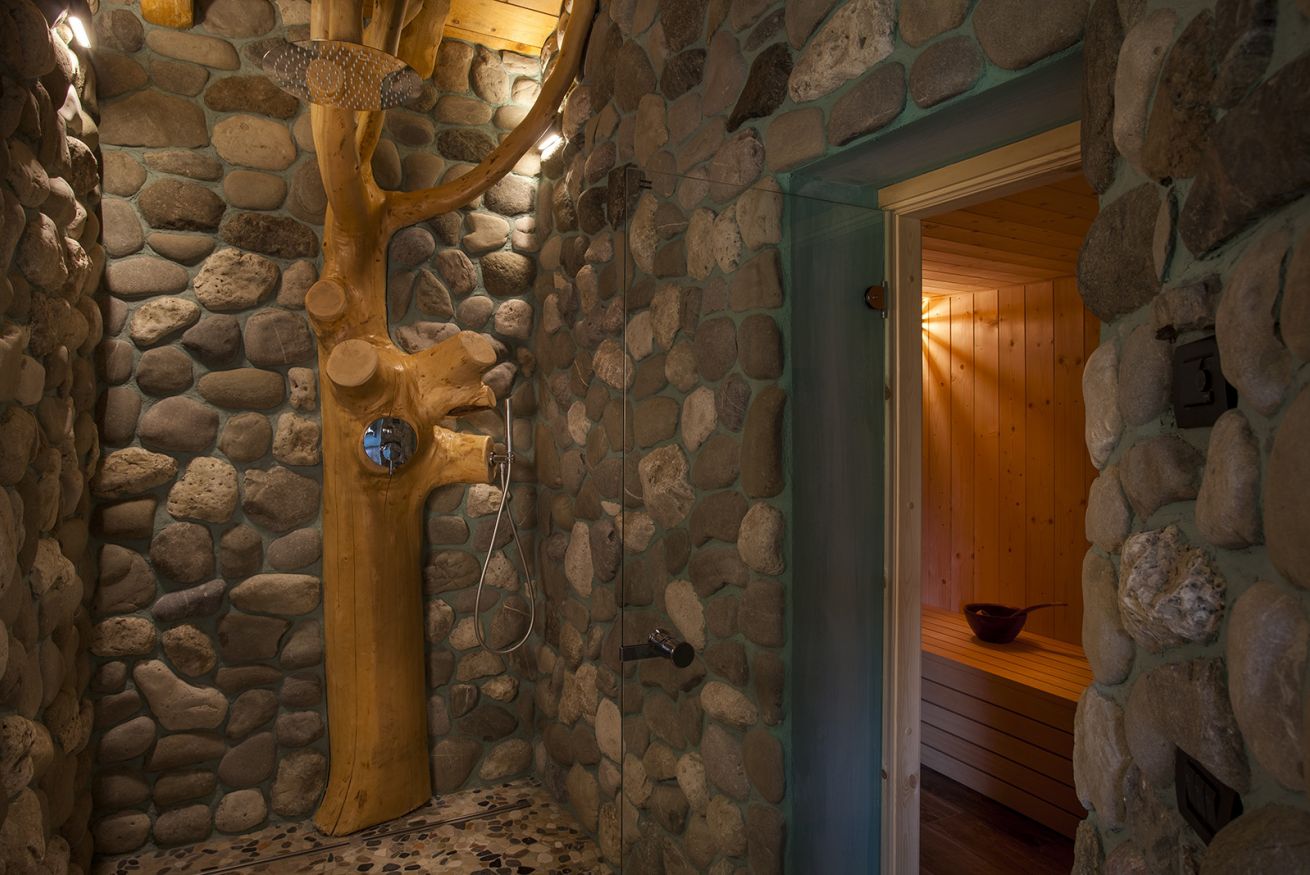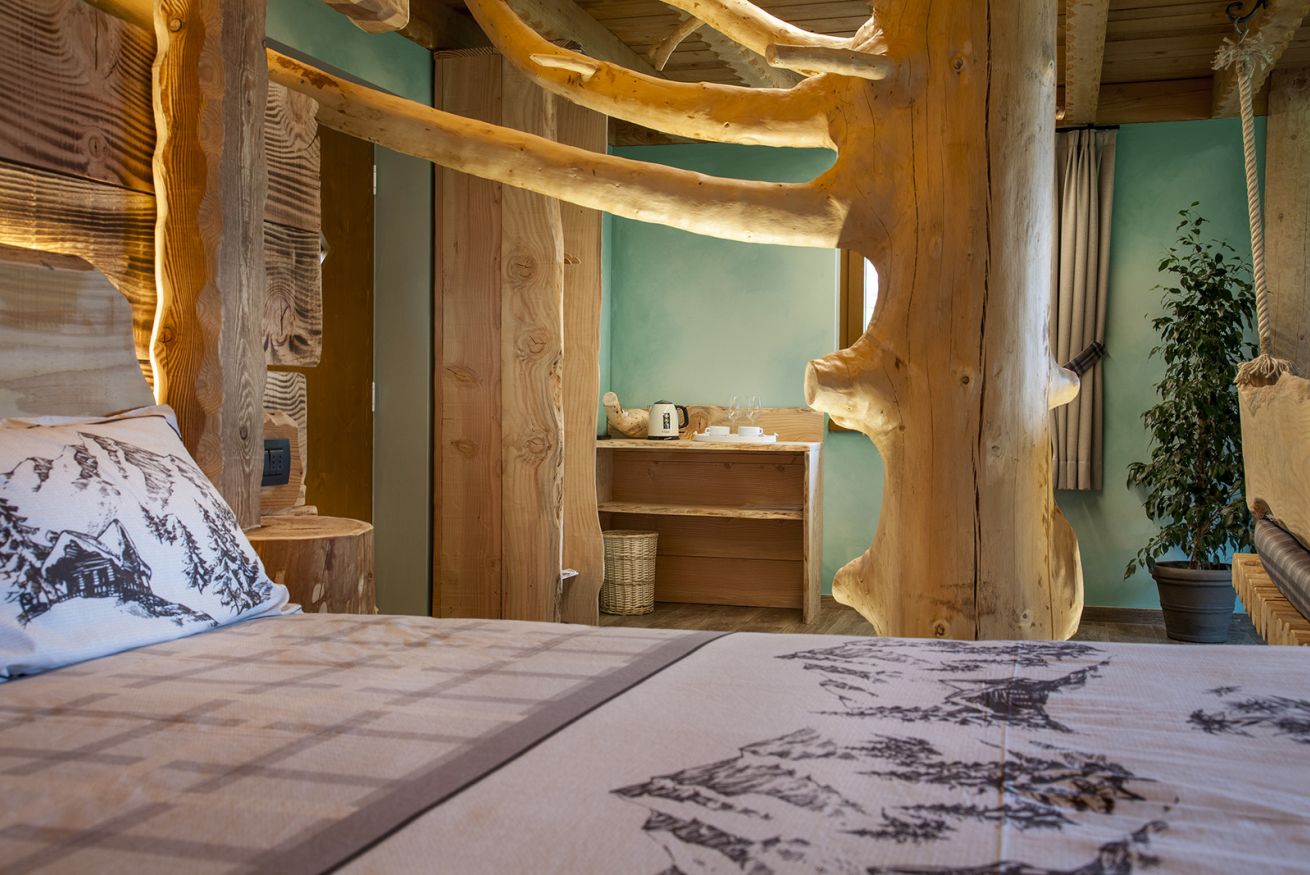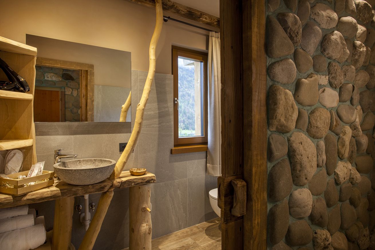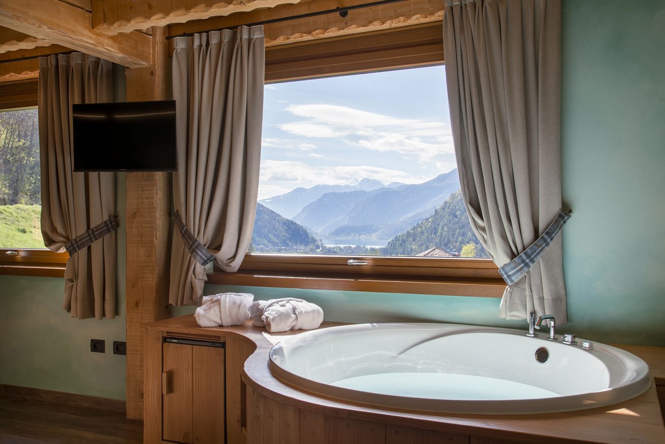 La camera (60 mq) dispone di un letto matrimoniale in legno di larice, vasca idromassaggio con vista panoramica sulla valle e il lago di Ledro, sauna finlandese e doccia a vista con copertura in sassi. Nella zona soggiorno ci sono il caminetto a legna, divano in legno di larice, TV-Sat, mini frigo e bollitore per tè e tisane. Il wi-fi è gratuito. Per chi viaggia con la bicicletta è a disposizione un vano per il deposito delle bike.