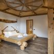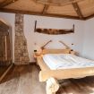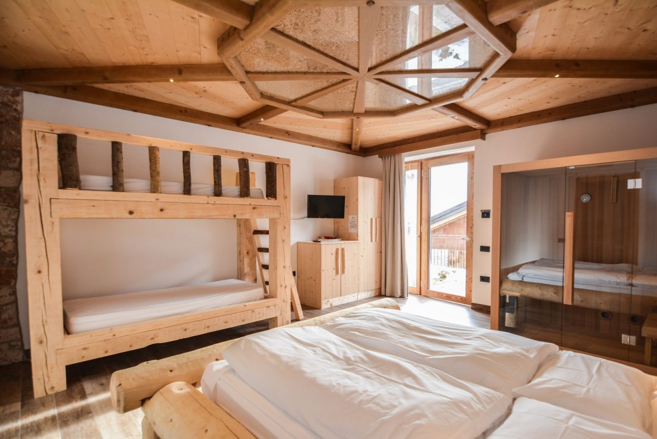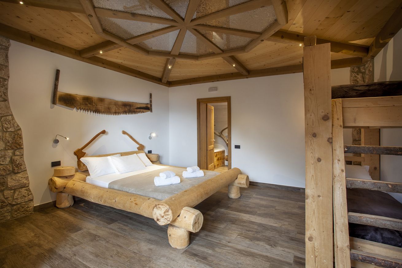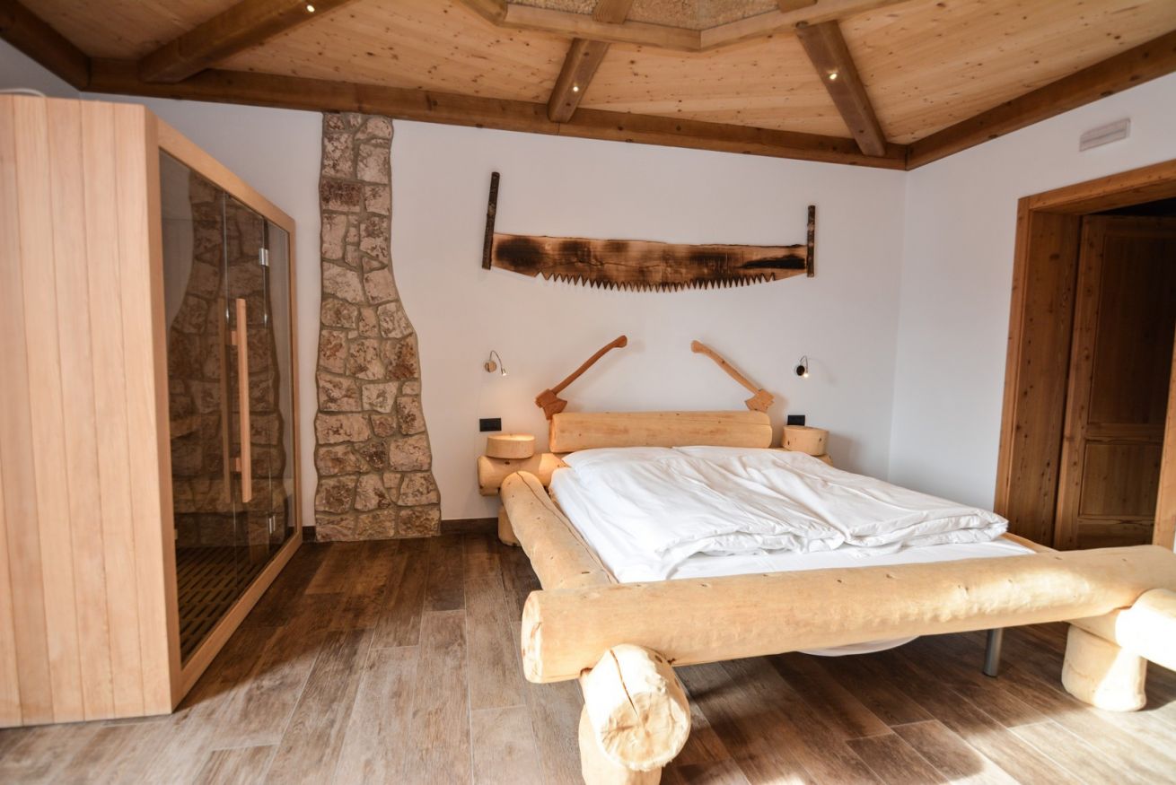 Composta da un letto matrimoniale e da un letto a castello in legno, la camera “BORÉR” (35 mq) presenta una delle attività di famiglia: il tagliaboschi. L'originalità dell'arredamento e della composizione del soffitto sorprendono. Diversi i comfort presenti: la cabina sauna (a secco), la doccia e la vasca idromassaggio in bagno consentono di trascorrere momenti di benessere. L'accesso indipendente alla camera è introdotto da uno spazio verde privato con tavolino e sedie.